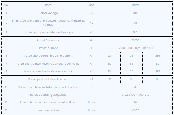 ဗို့အားအဆင့်သတ်မှတ်ချက် -40.5Kv (95 ကီလိုဗွန်းလျှပ်စီးငွေကိုခံနိုင်ရည်ရှိခြင်း) ။